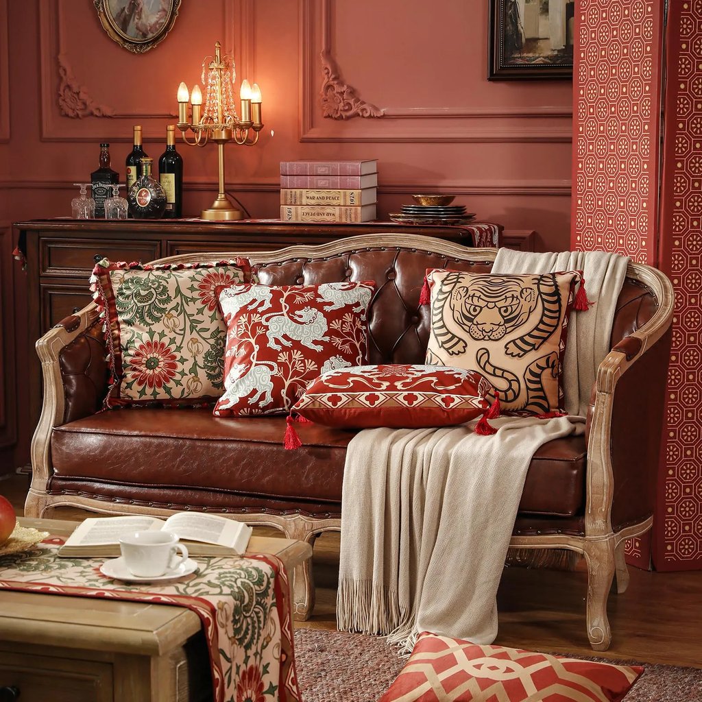 Tecido de veludo vermelho e almofadas estampadas sobre o sofá.